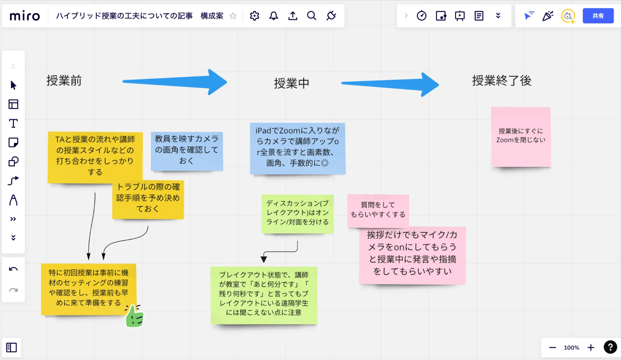 ツールには,Padlet・Miroなどが挙げられます.特にMiroは,操作がしやすく,少々込み入った作図にも対応しているため,便利です.