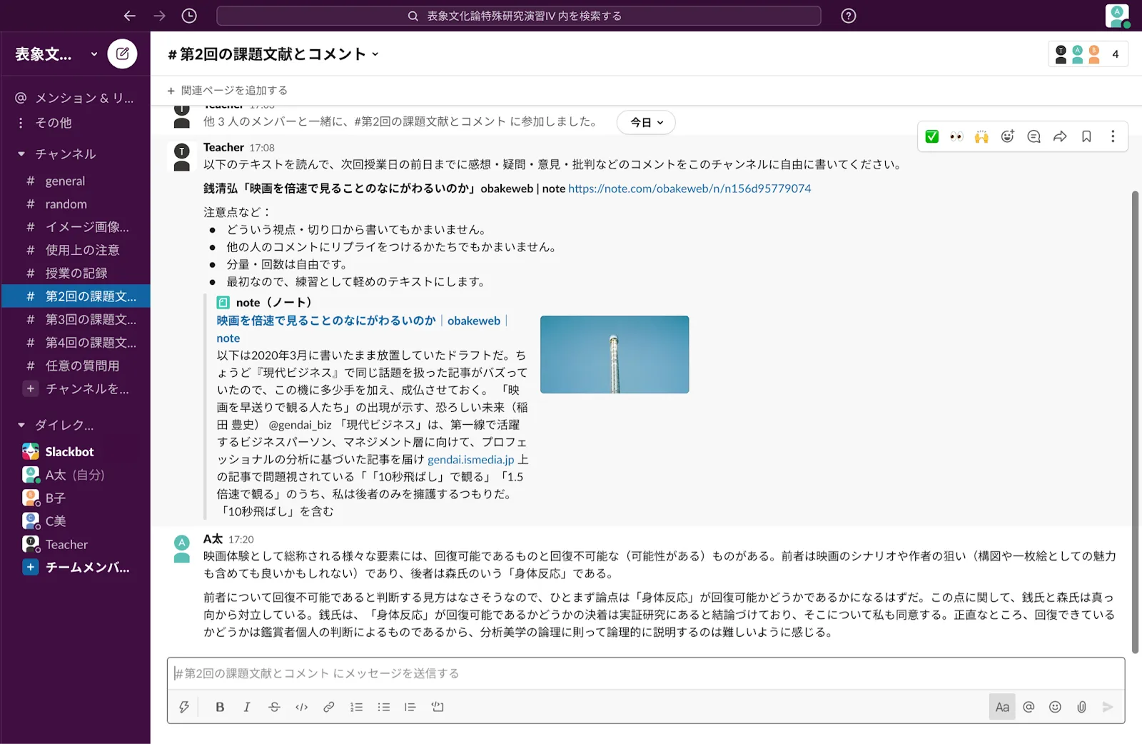 - 課題文献ごとにひとつのチャンネルを用意します.授業の1週間前に課題文献をスレッドの形で提示します.
