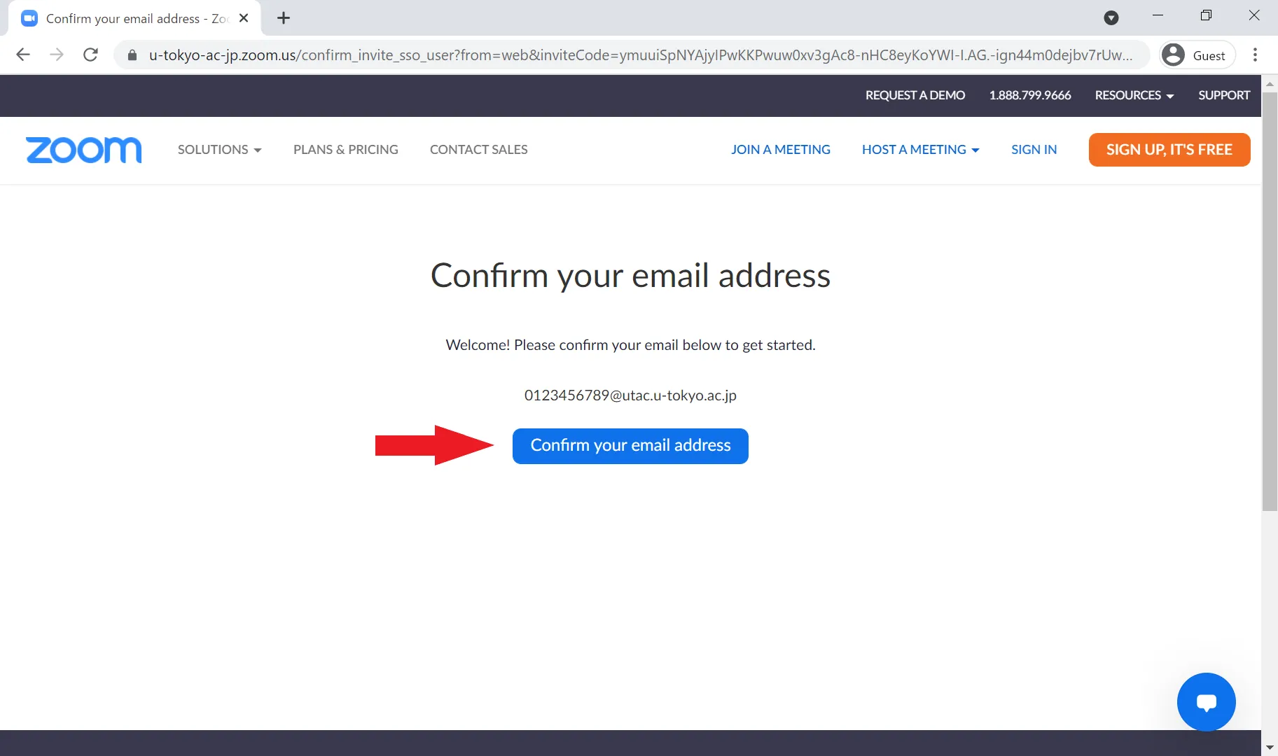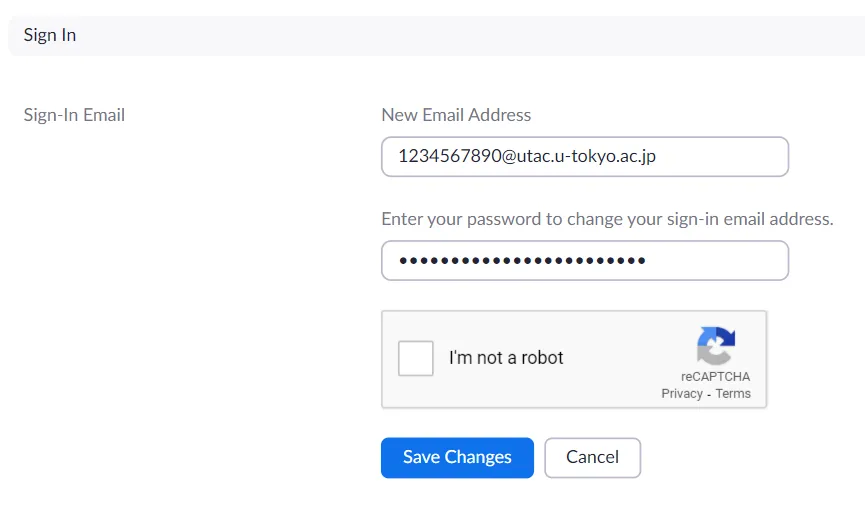 An account using1234567890@utac.u-tokyo.ac.jpalready exists. This account needs to be deleted. Please fill out and submit the Zoom Account Delete Request Form. After you receive an email confirming that deletion is completed, restart from step 1 to change your sign-in email address. - An email will be sent to your ECCS Cloud Email to confirm your sign-in email address change. Click the confirmation button in the email.