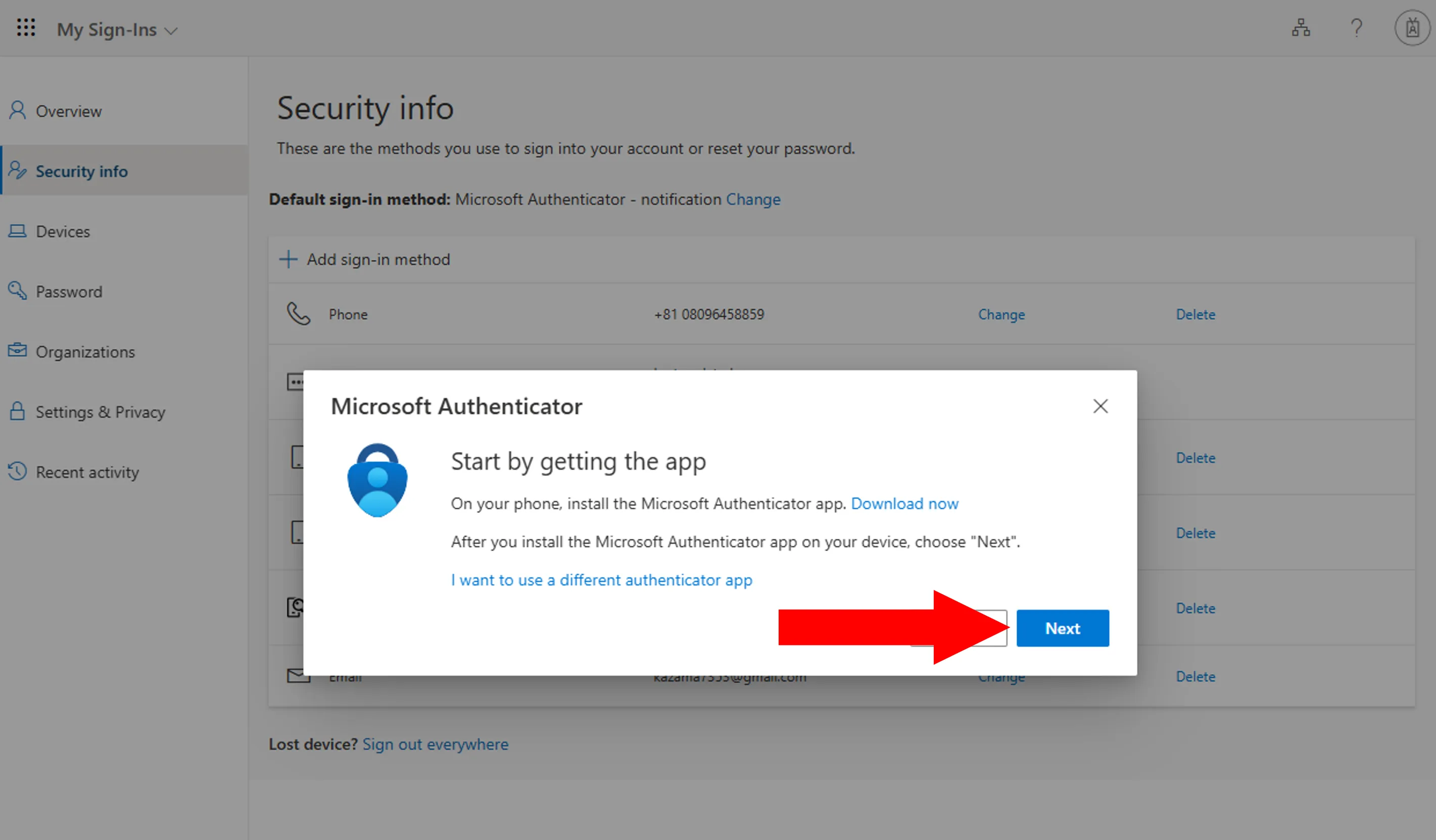 Next, add alternative verification methods (second and subsequent methods) from the Security info page