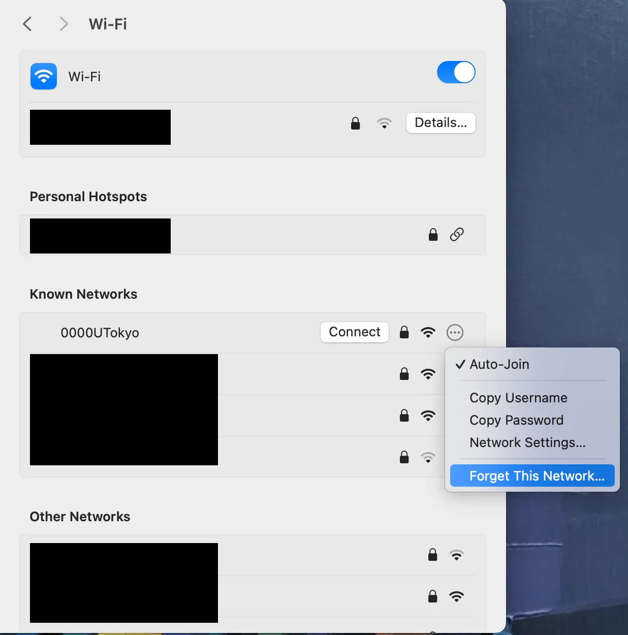 If the screen for entering a Account name and a password does not appear in Step 2 and it fails to connect to the Wi-Fi, you need to delete the existing setting and register a new one. This is necessary because although once you reissue your account and your previous account becomes invalid, your devices may still store it. Before using the new account, your devices must “forget” the previous one. There is no need to worry about never being able to connect to the UTokyo Wi-Fi again upon “deleting” a account.Select the SSID found in Step 2 and then select “Forget This Network” on the displayed screen. When a screen asking “Forget Wi‑Fi “0000UTokyo”?” appears, select “Remove”.