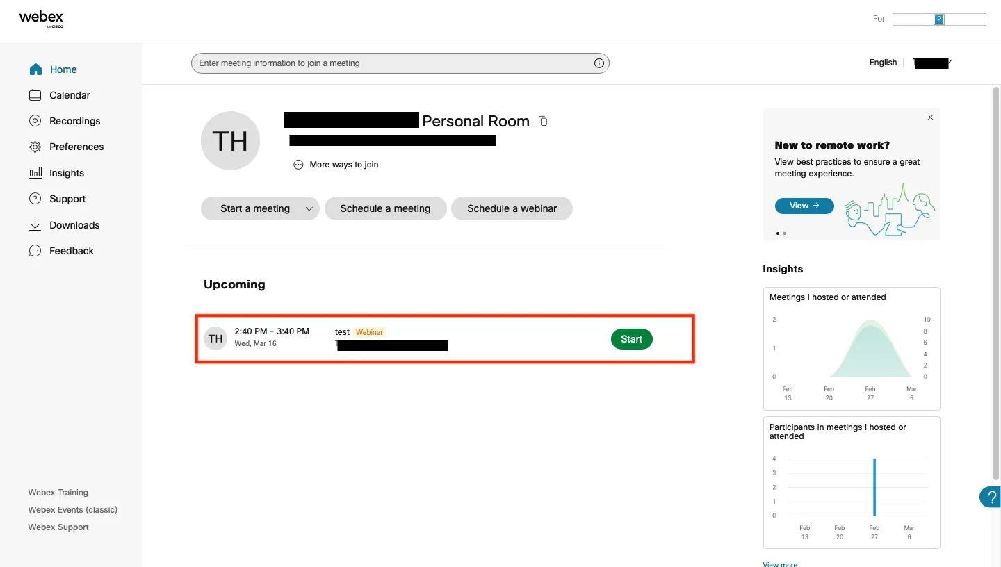 To schedule a Webex Webinar, click “Schedule a webinar” on the home screen to configure the settings.