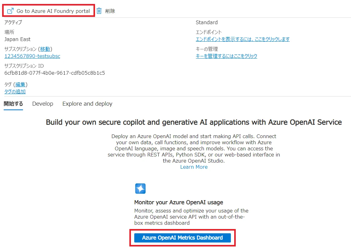 Azure OpenAI のトップページに遷移するので,画面右上のGo to Azure AI Foundry Portalまたは画面下のAzure OpenAI Metrics Dashboardをクリックしてください.