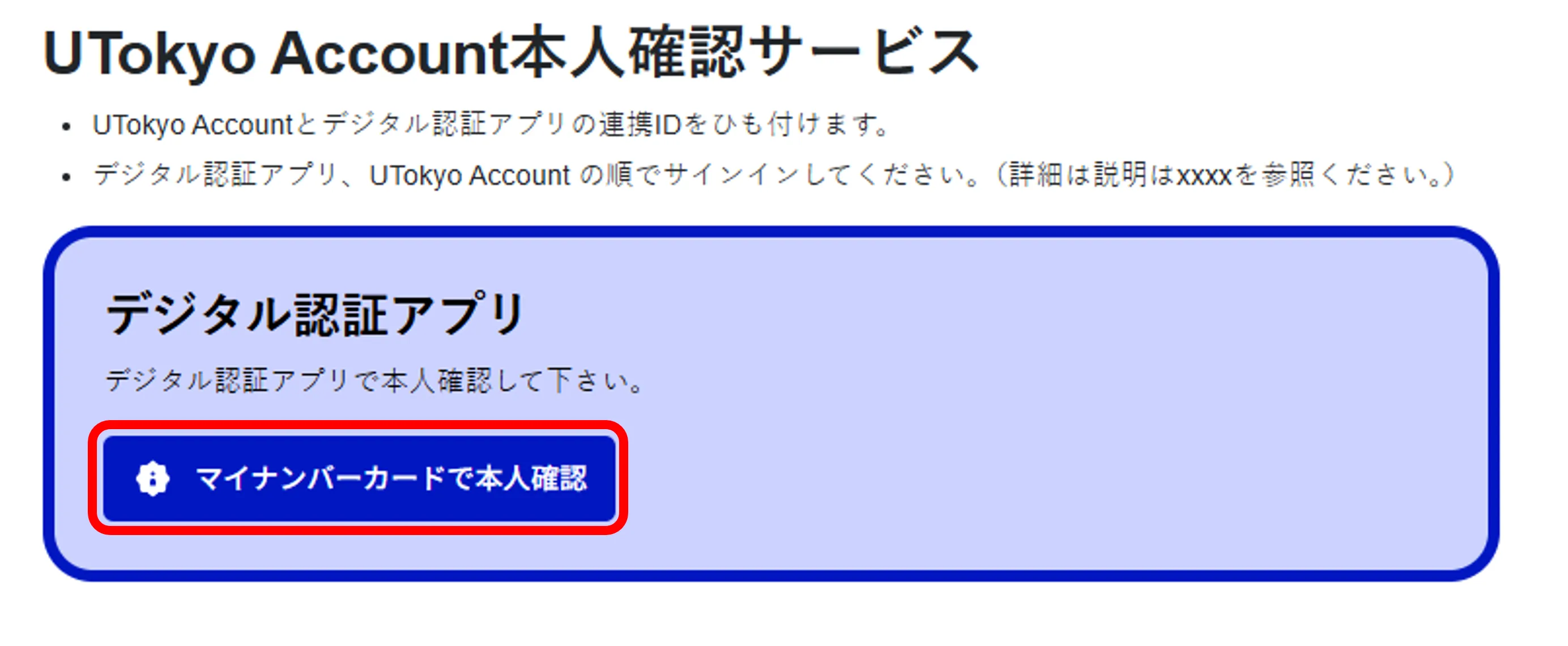 UTokyo Account 本人確認サービス(以下「本人確認サービス」)は,UTokyo Accountにサインインできない場合に,UTokyo Accountと事前連携しておいたマイナンバーカードを用いて,オンラインで本人確認を行う仕組みです.