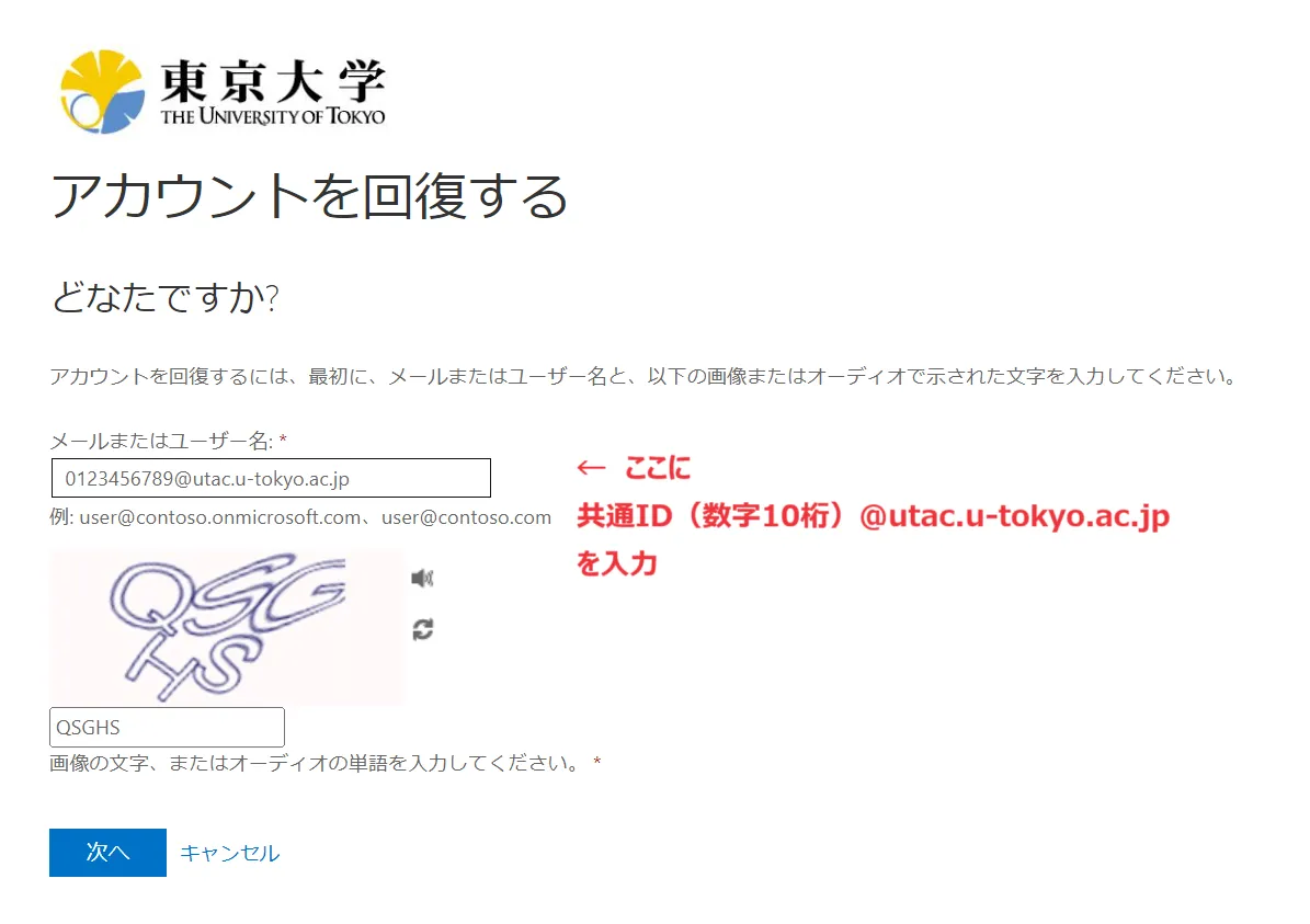 @utac.u-tokyo.ac.jp」を,その下の欄に画像の文字を入力してから「次へ」を押してください.