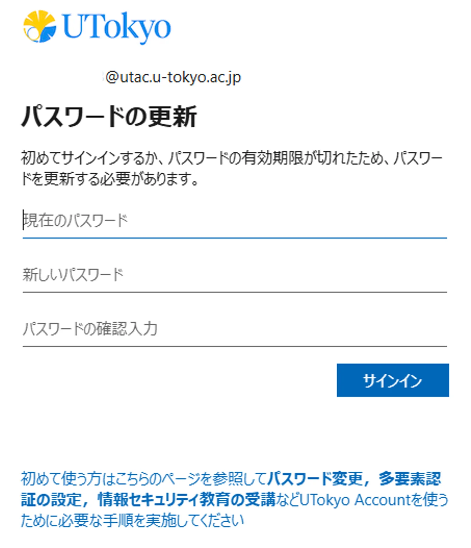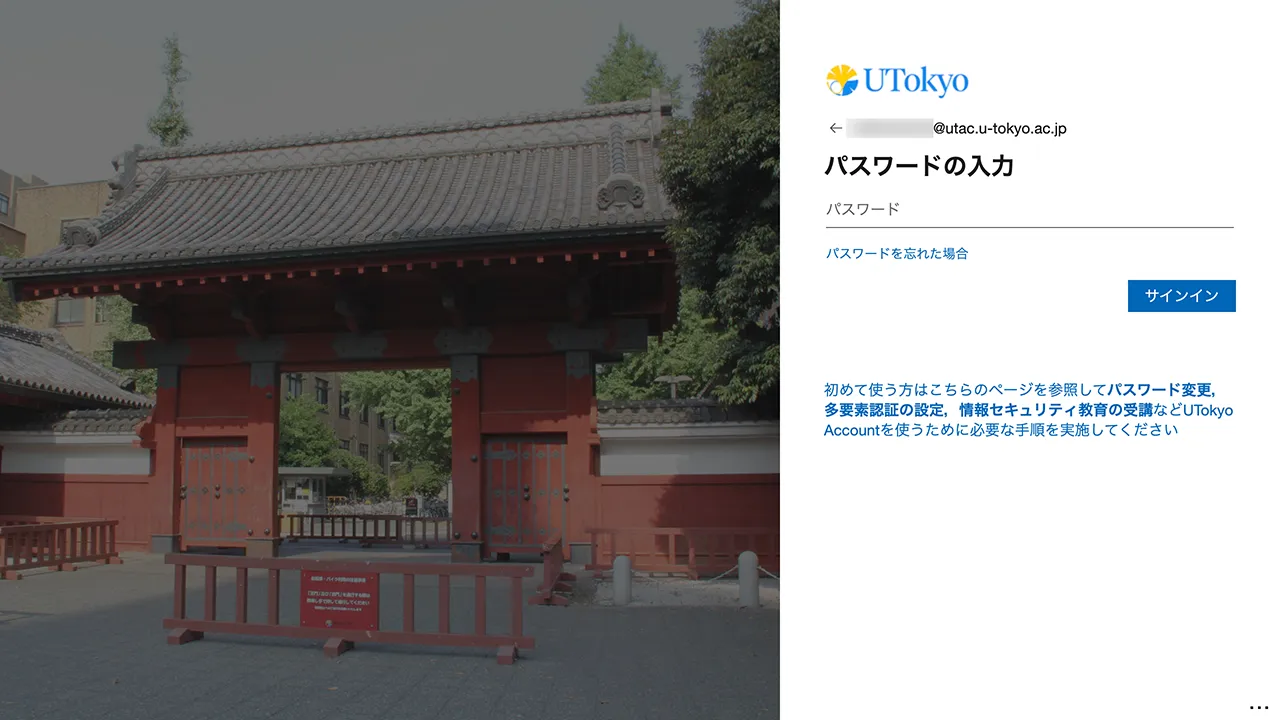 @utac.u-tokyo.ac.jp)と仮パスワードを入力してください.サインイン画面が表示されない場合