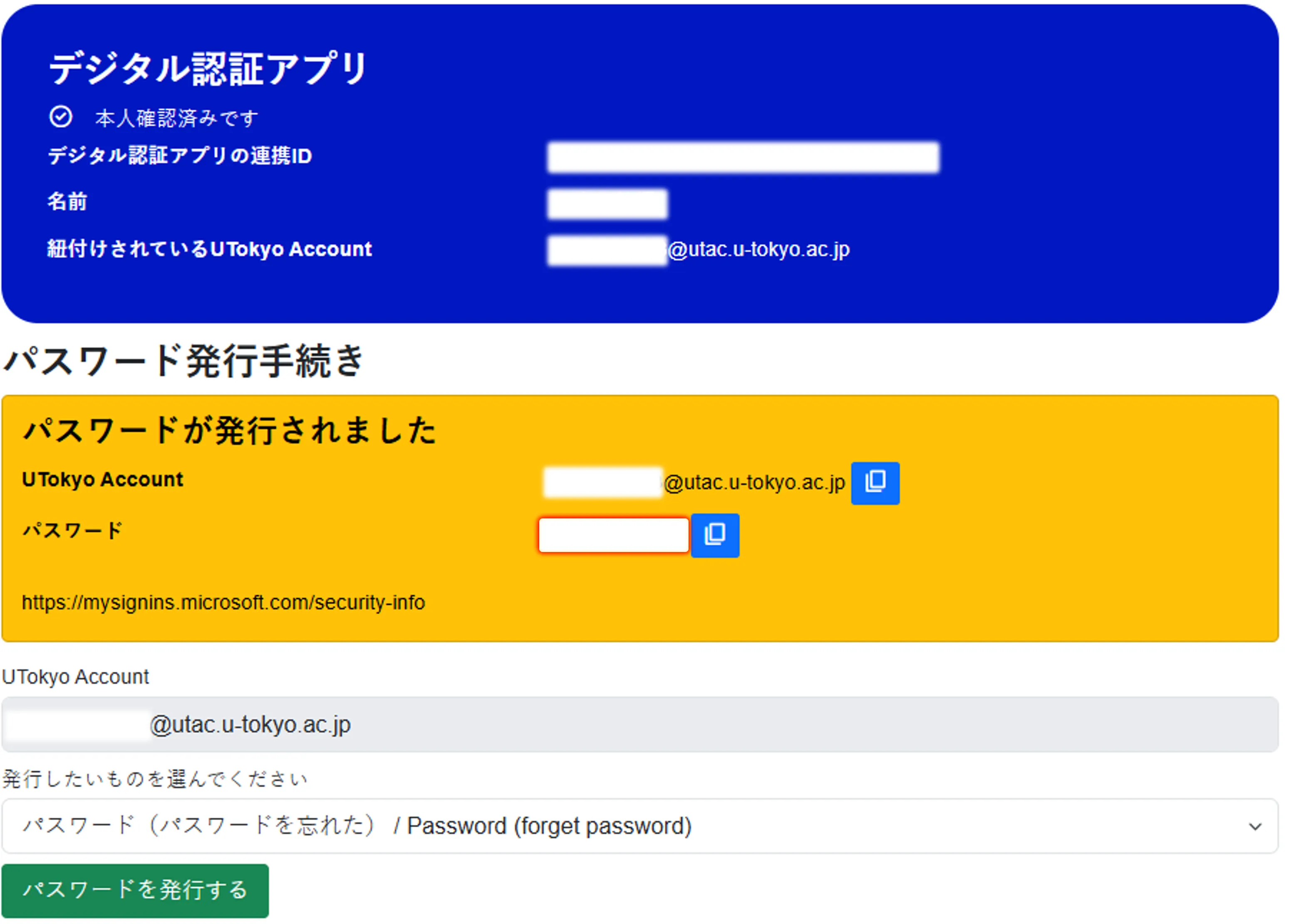 「パスワードが発行されました」と表示されます.表示された仮パスワードをコピーし,UTokyo Accountでの認証が必要なページ(例:セキュリティ情報)にアクセスしてください.