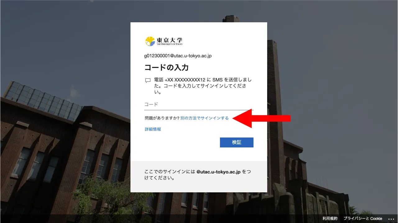 @utac.u-tokyo.ac.jp)とパスワードを入力してください. - 続いて多要素認証の本人確認が行われます.本人確認方法により手順が異なりますので,画面の指示に従って操作してください.