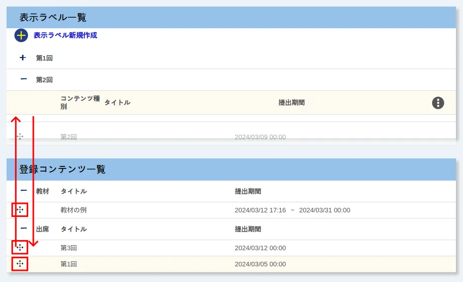 2. コンテンツ名の左側のドラッグ&ドロップのアイコンを押しながら,コンテンツをドラッグ&ドロップしてください.