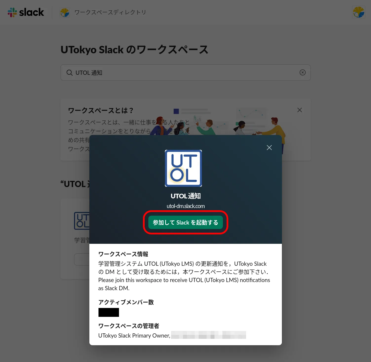 - 参加が完了すると,ワークスペースの画面が表示されます.「UTokyo Slack」タイトルの直下にあるワークスペース一覧を開き,「UTOL 通知」が含まれていることを確認してください.