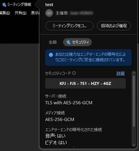 2. 会議始めに,「ミーティング情報」の「セキュリティ」をクリックして表示されるセキュリティコードが全員一緒であることを音声等を通じて確認します.