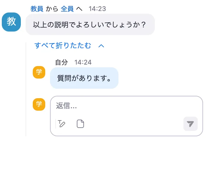 自分または他の参加者が送信したメッセージに対し,返信することができます.また返信すると,元のメッセージの下部にスレッドが自動的に作成され,話題ごとにチャット欄を整理することができます.