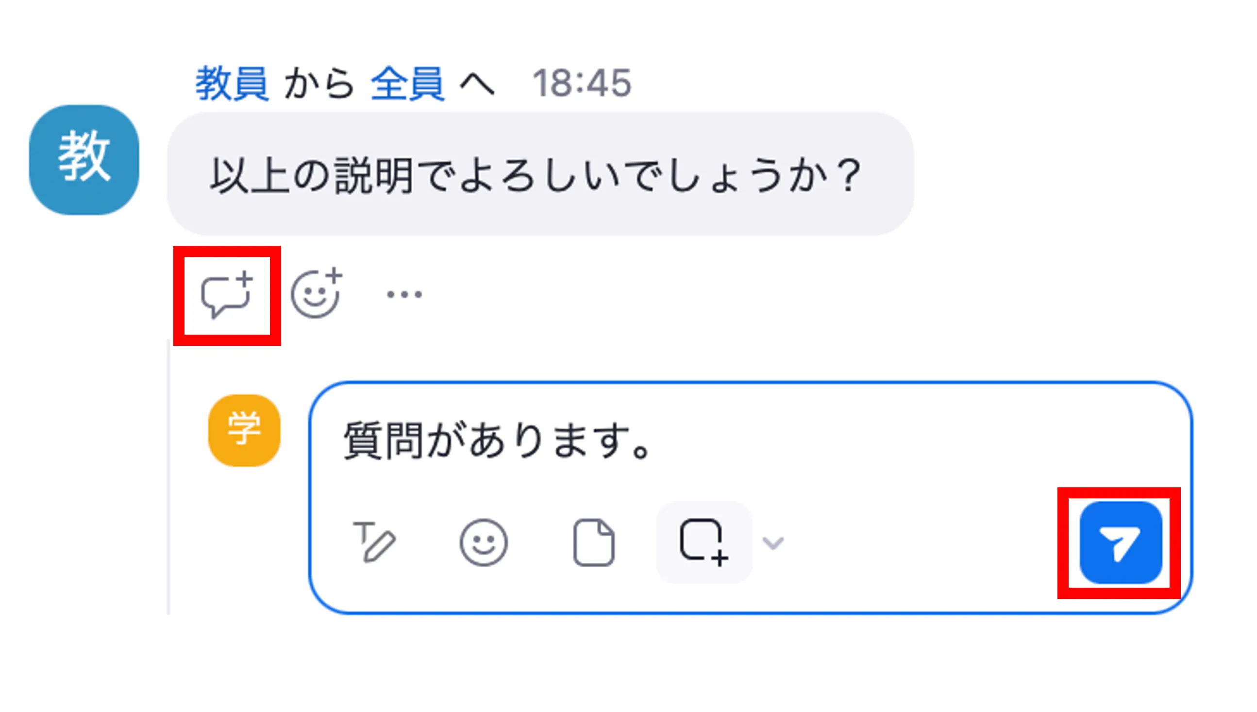 メッセージを入力し,送信アイコン(紙飛行機のアイコン)を押して送信してください.