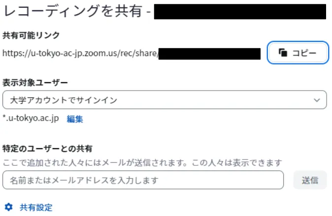 - 「特定のユーザーとの共有」欄を適切に設定することで,レコーディングの視聴を許す相手を個別に指定できます.